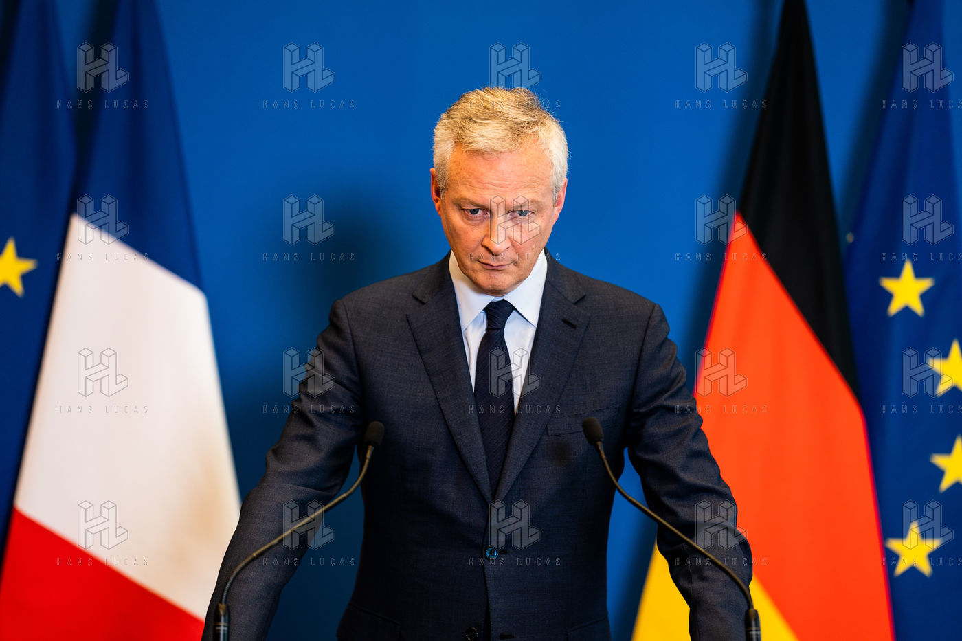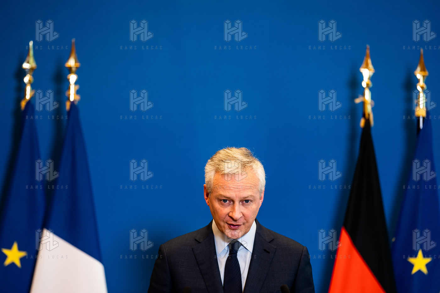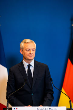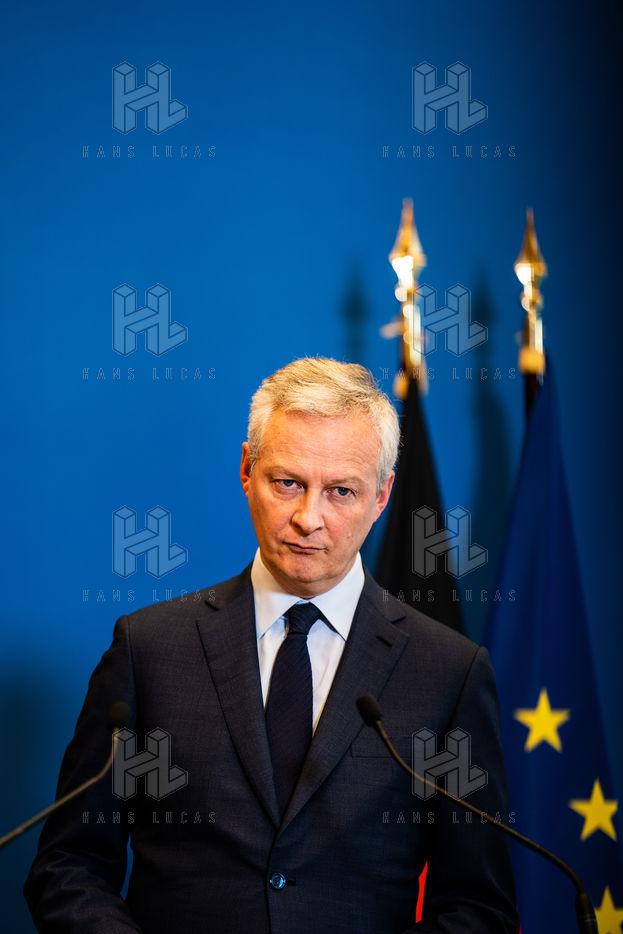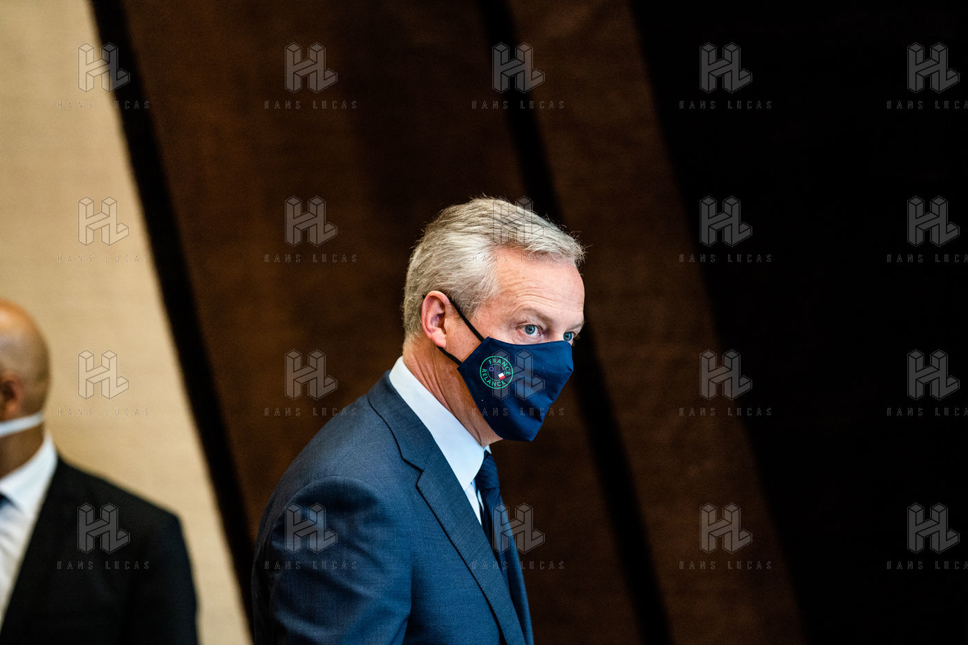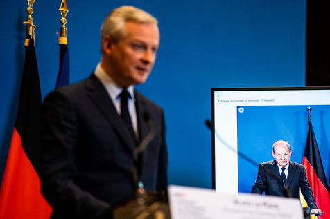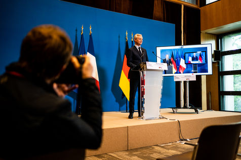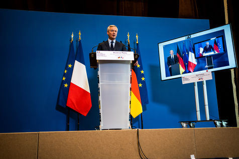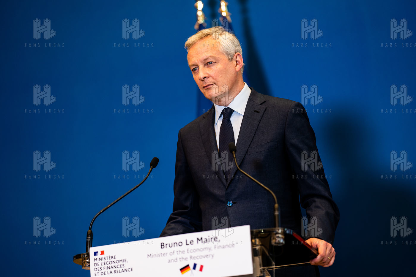 Point presse conjoint de Bruno Le Maire, ministre de l'economie, des finances et de la relance et d?Olaf Scholz, Vice-chancelier d'Allemagne, ministre des Finances de la République fédérale d'Allemagne, en amont du Conseil économique et financier franco-allemand (CEFFA), par vidéoconférence au Ministère de l'Économie et des Finances de la République française, au Ministère de l'Économie et des Finances de la République française, Paris 26 mai 2021.