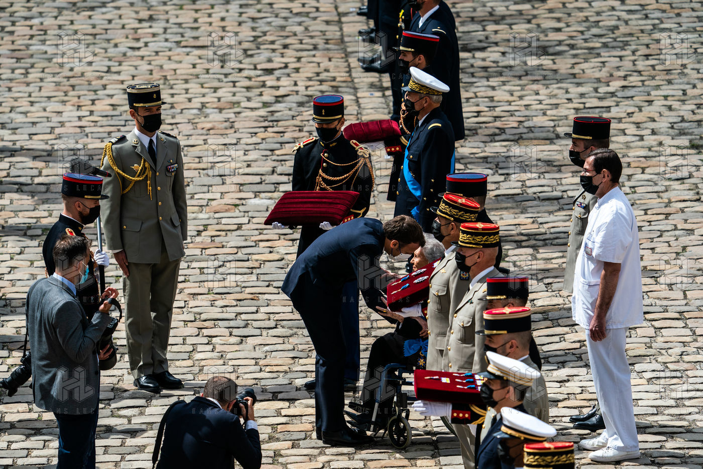 Le Président de la République, Emmanuel MACRON, préside la prise d'armes qui se déroulera le jeudi 8 juillet 2021, dans la cour d'honneur de l'Hôtel national des Invalides. A cette occasion, le chef de l'Etat procède à une remise de décorations en hommage à des combattants, militaires en activité ou participants des conflits de l'Histoire contemporaine de notre pays, qui se sont illustrés récemment ou dans le passé.