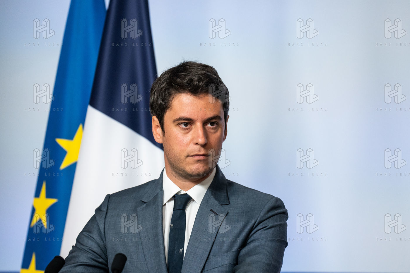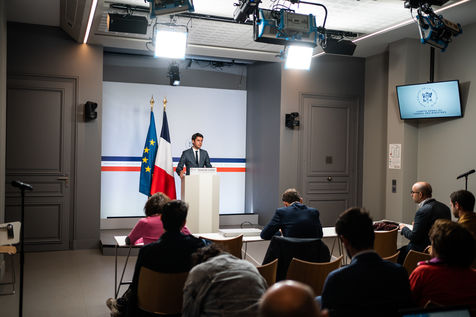 Gabriel Attal, porte-parole du gouvernement, fait un compte-rendu à l'issue du conseil des ministres, dans la salle du porte-parole, Paris 20 avril 2022.