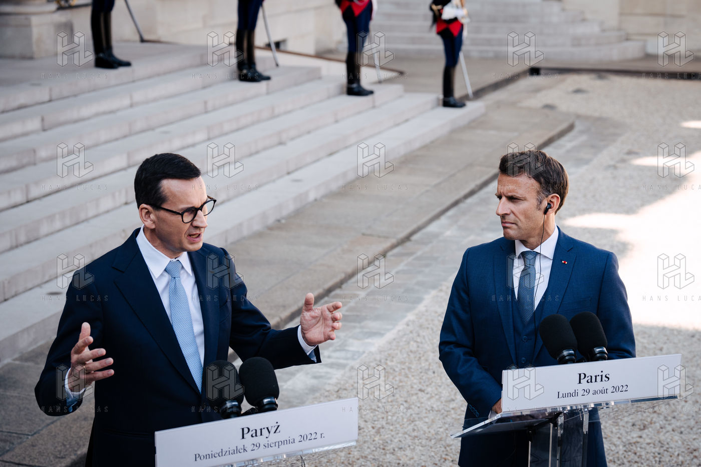 Rencontre entre Mateusz Morawiecki, président du Conseil des ministres de Pologne, et Emmanuel Macron, président de la République française, au palais de l'Élysée.