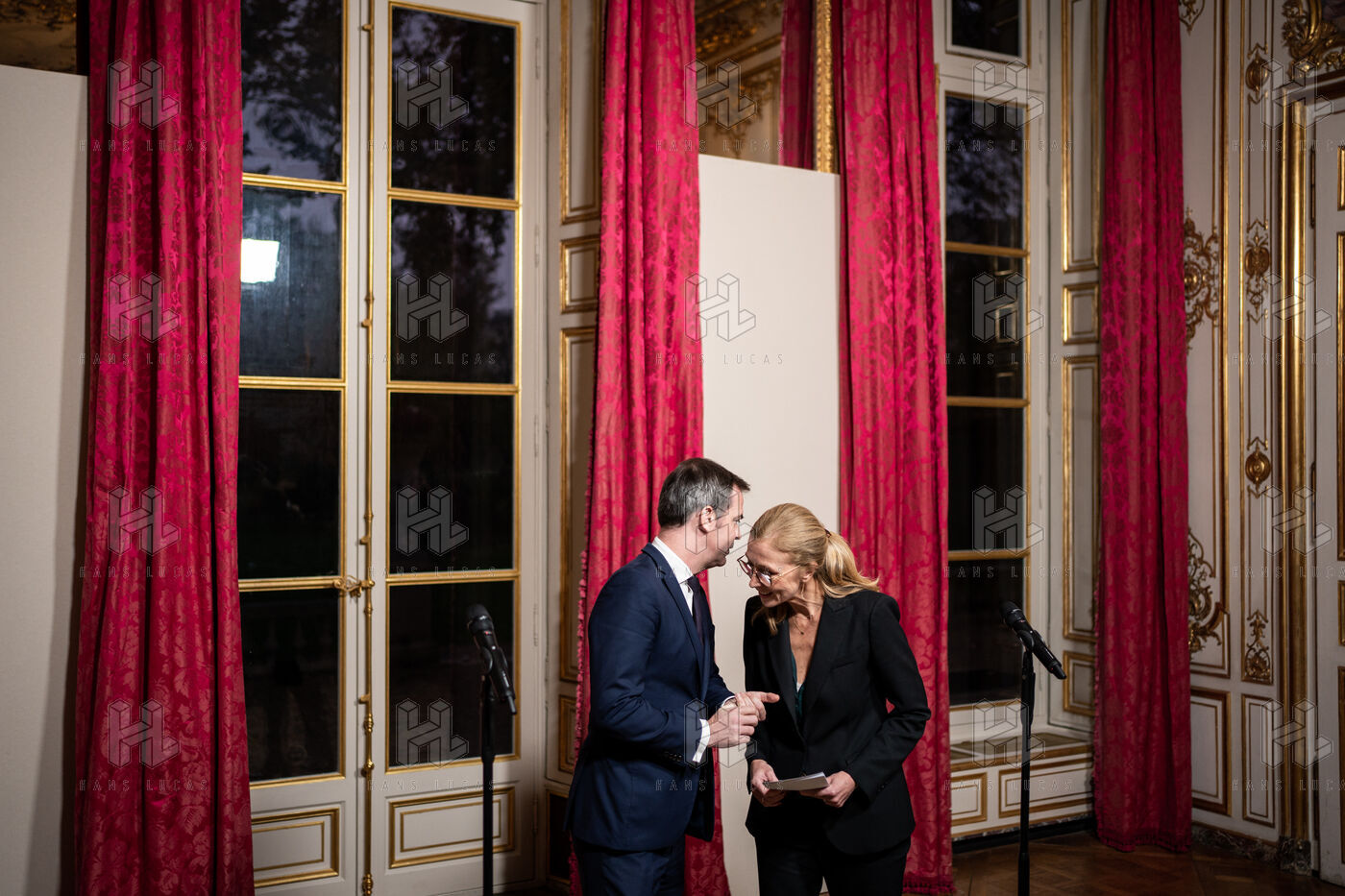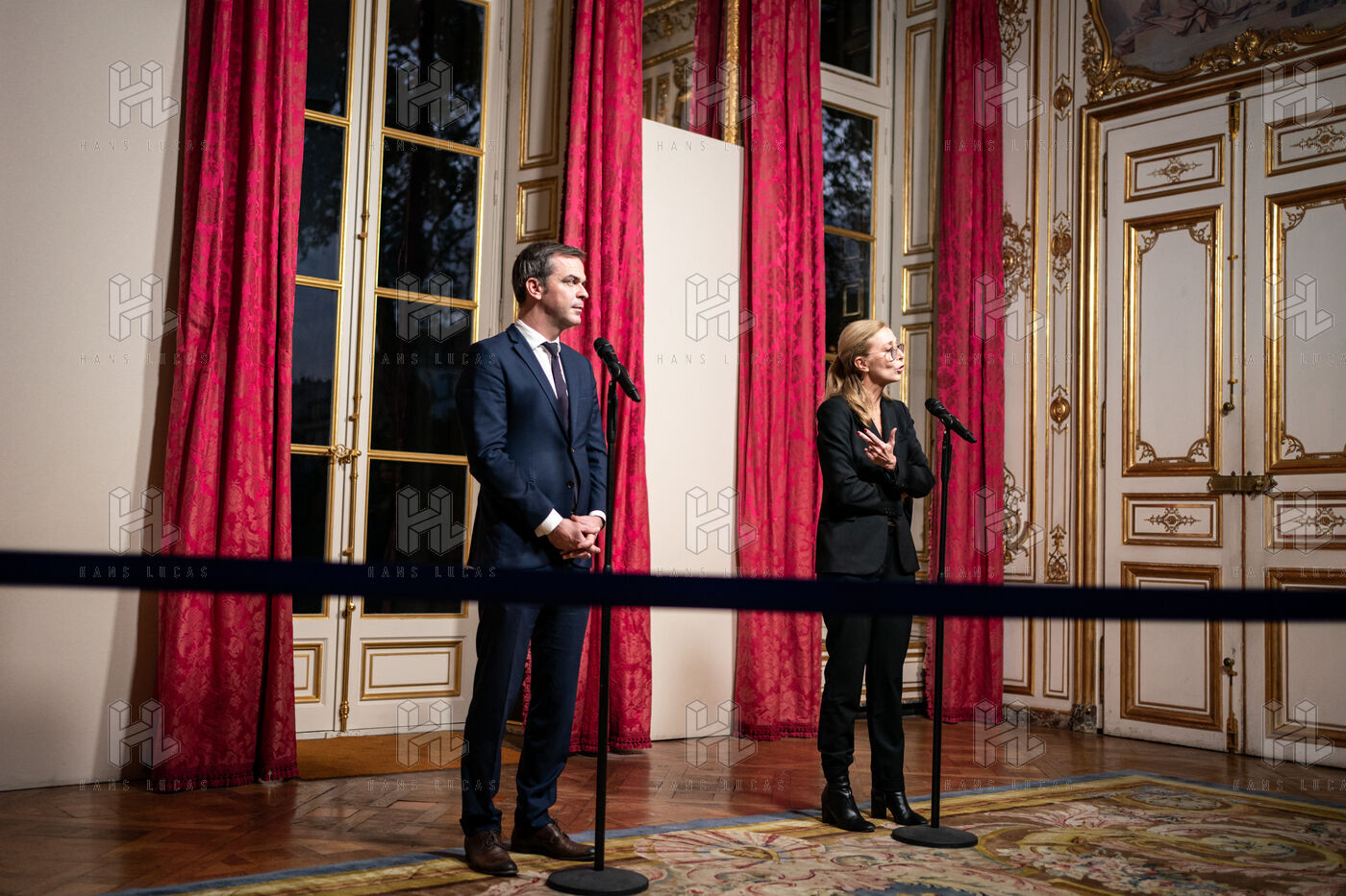 Conseil des enfants protégés et comité interministériel de l enfance à l hôtel de Matignon. Point presse d'Olivier Veran, ministre délégué auprès du Premier ministre, chargé du renouveau démocratique, porte-parole du gouvernement, et de Charlotte Caubel, secrétaire d'État auprès du Premier ministre, chargée de l'enfance, à l'Hôtel de Matignon.