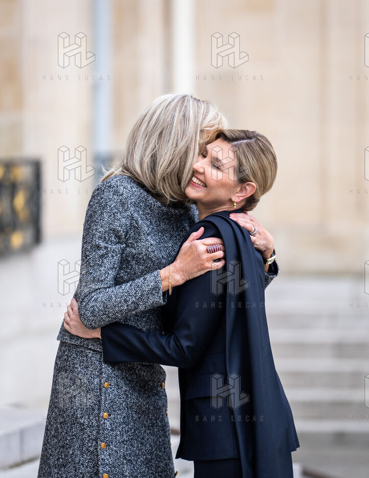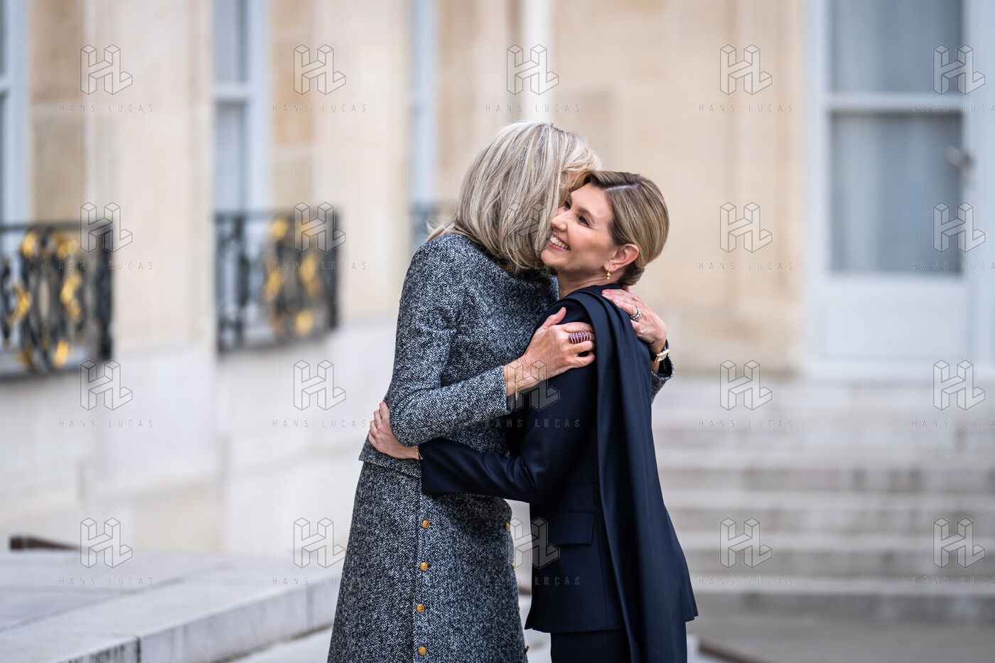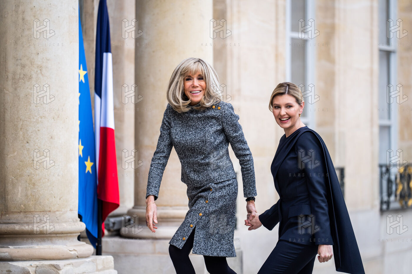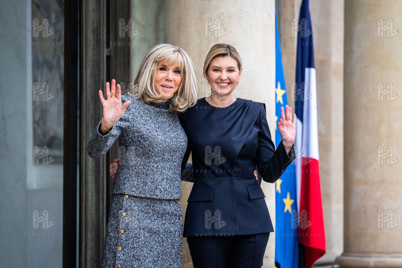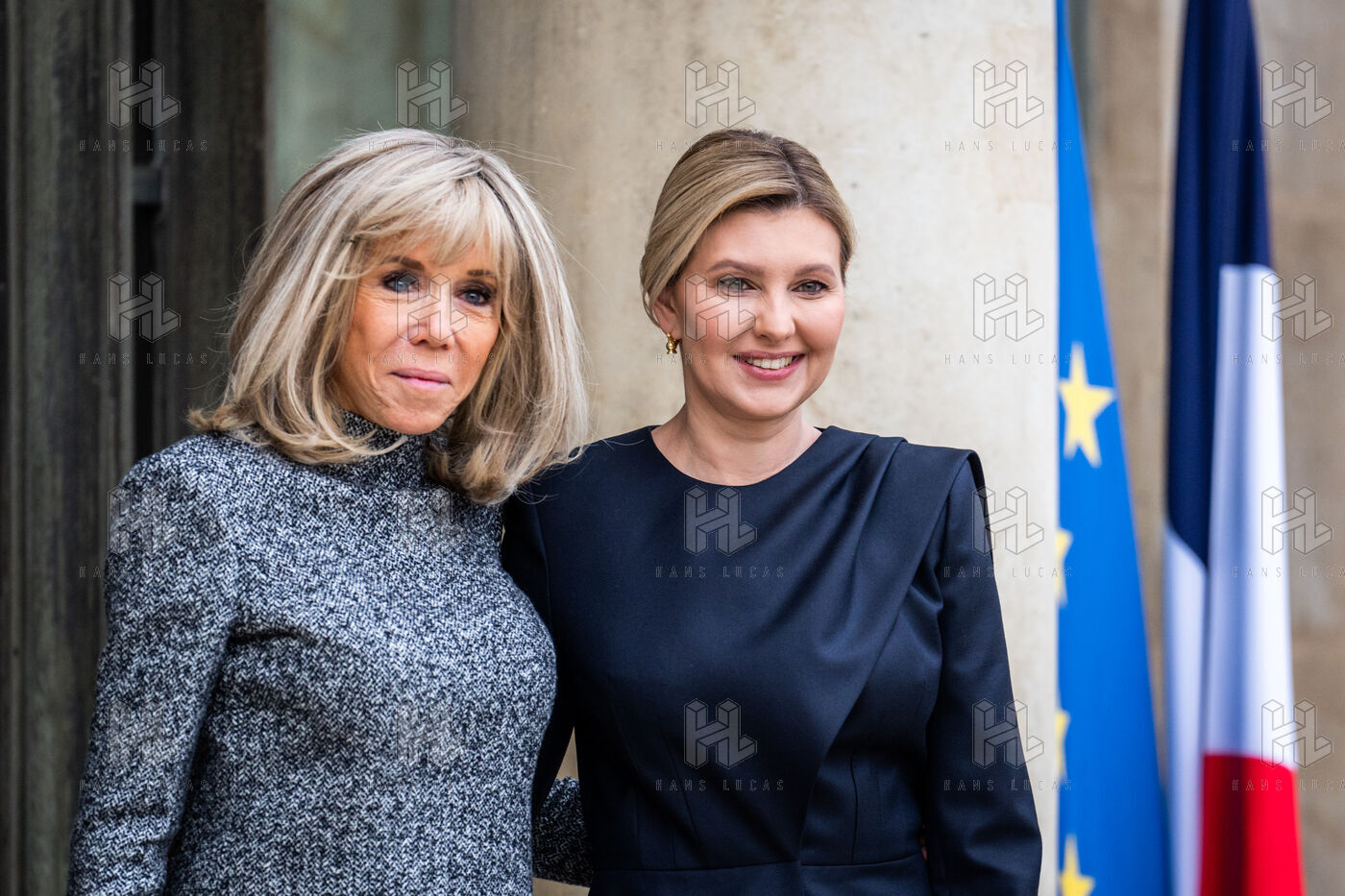 Reception of Olena Zelenska, television producer and current First Lady of Ukraine, wife of President Volodymyr Zelensky, received by Brigitte Macron, teacher, First Lady, wife of the President of the French Republic, at the Élysée Palace.