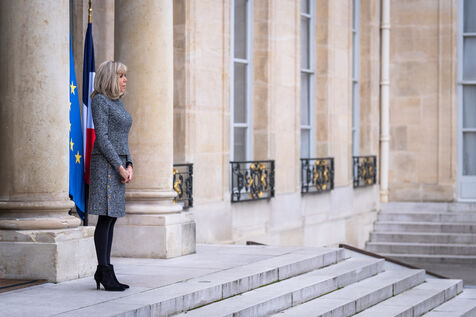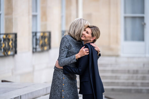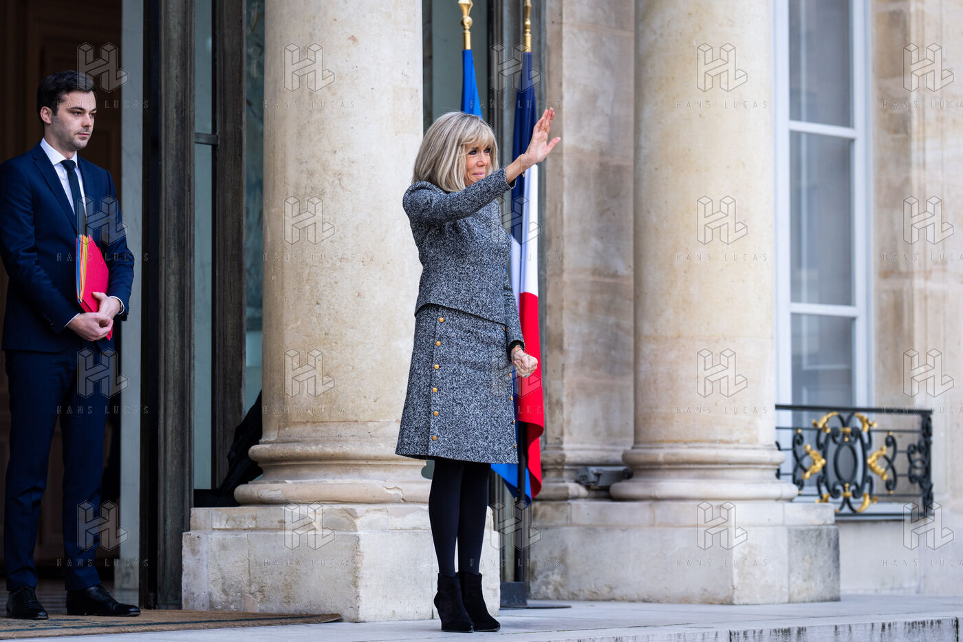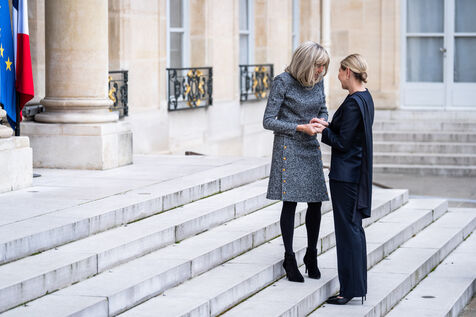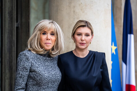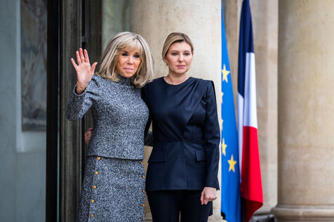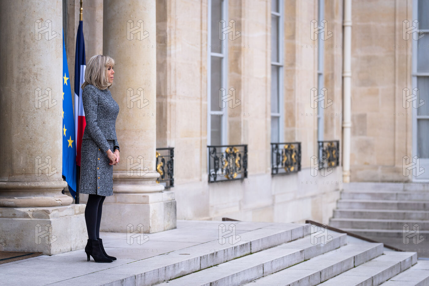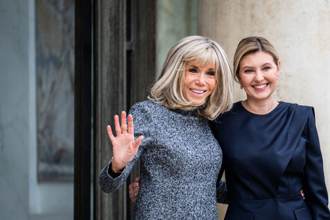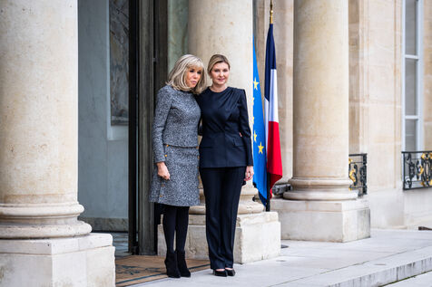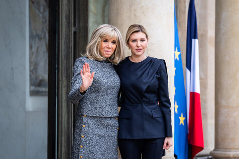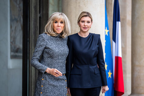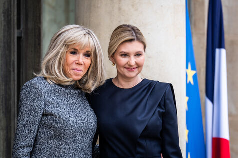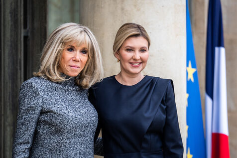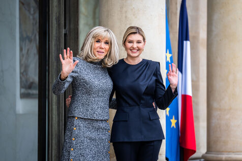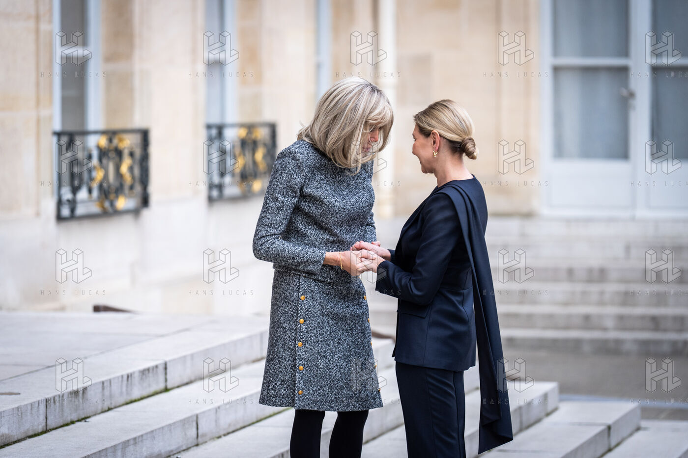 Reception of Olena Zelenska, television producer and current First Lady of Ukraine, wife of President Volodymyr Zelensky, received by Brigitte Macron, teacher, First Lady, wife of the President of the French Republic, at the Élysée Palace.