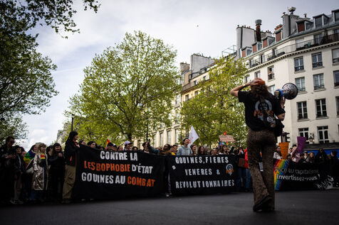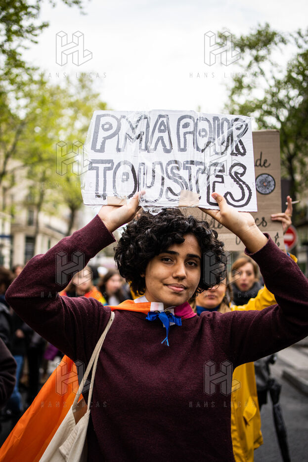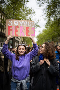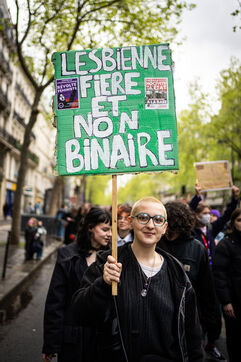 Marche lesbienne contre la lesbophobie d'Etat à Paris à l'appel de FièrEs, association féministe radicale et révolutionnaire liée aux identités lesbiennes, gays et trans. L'objectif principal de l'association est de contribuer à la destruction du système cishétéro-patriarcal, raciste et capitaliste dans toutes ses dimensions, dix ans après le vote définitif de la loi du mariage pour tous, ouvrant le mariage et l'adoption aux couples homosexuels.