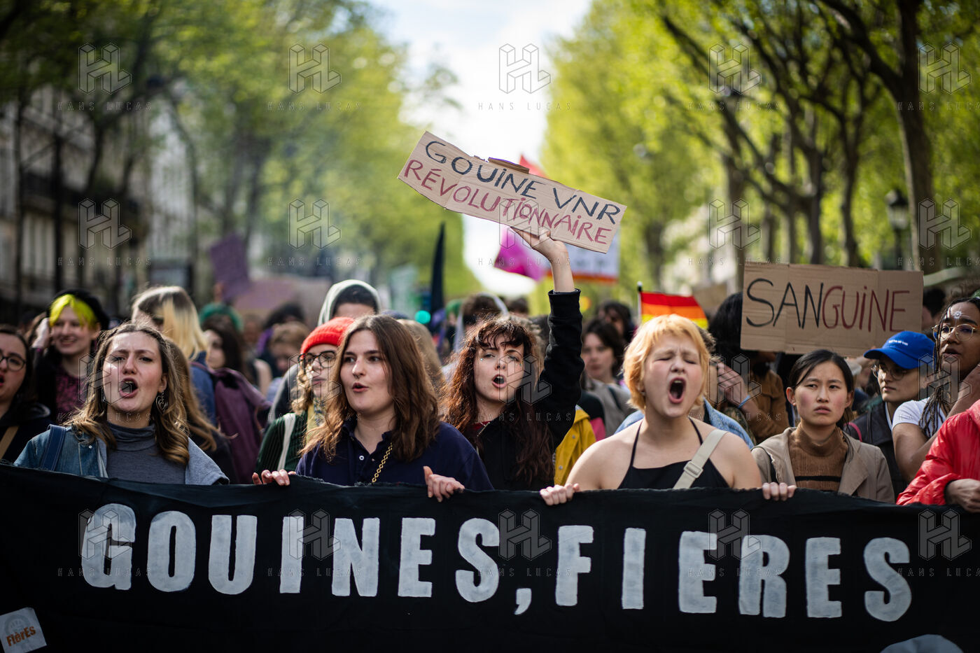 Lesbian march against state lesbophobia in Paris at the call of FièrEs, radical and revolutionary feminist association linked to lesbian, gay and trans identities. The main objective of the association is to contribute to the destruction of the cishetero-patriarchal, racist and capitalist system in all its dimensions, ten years after the final vote of the law of marriage for all, opening marriage and adoption to homosexual couples.