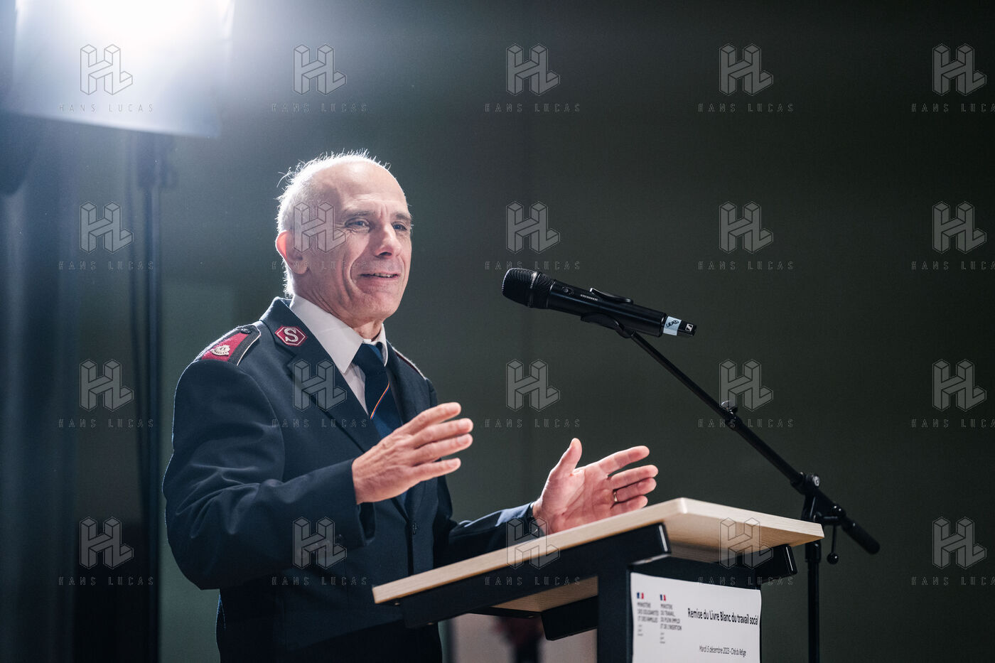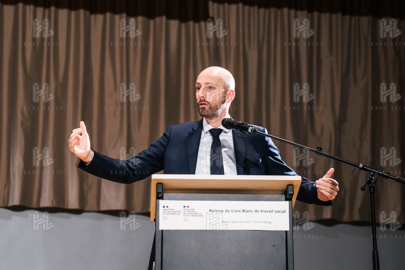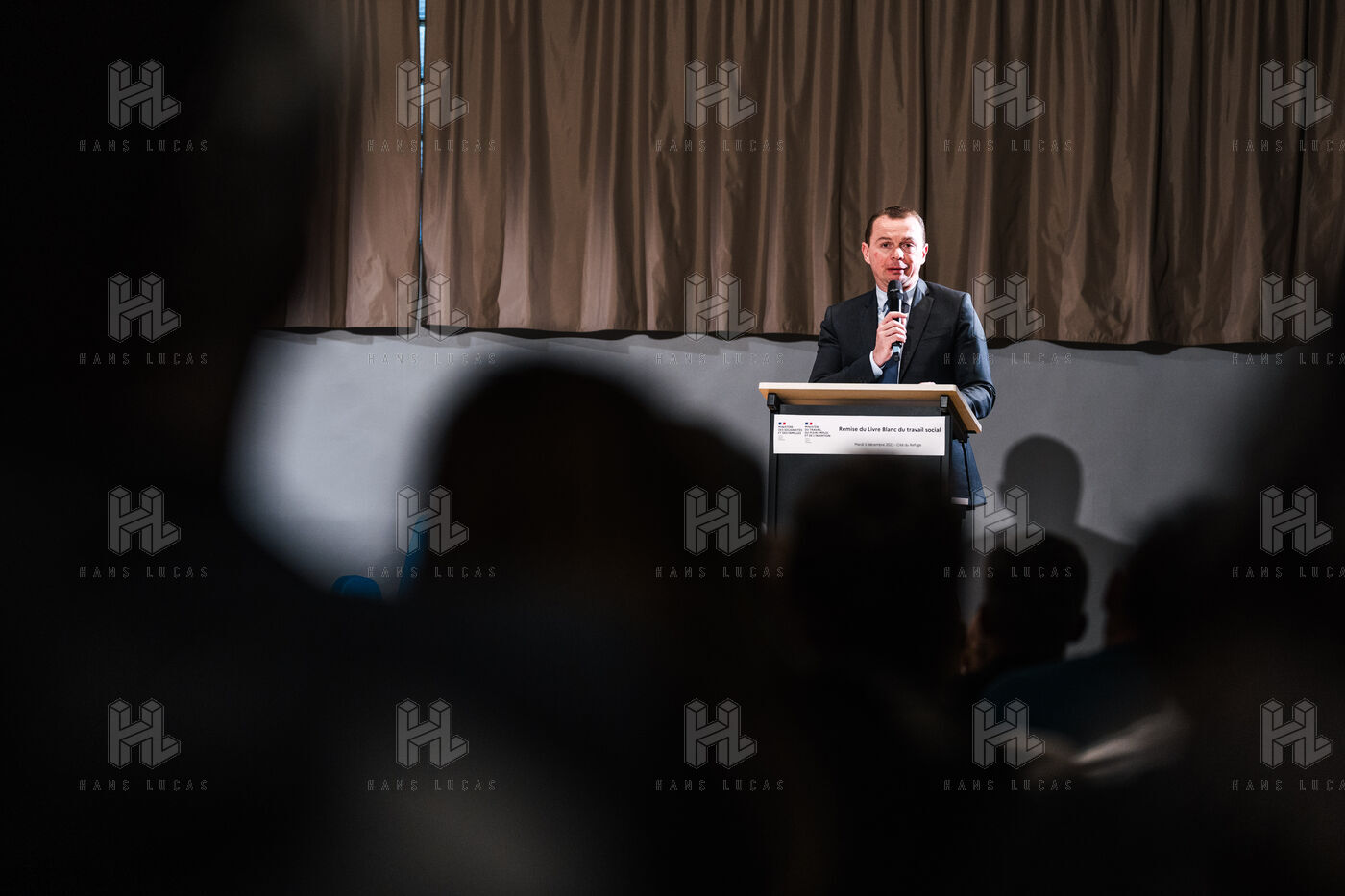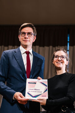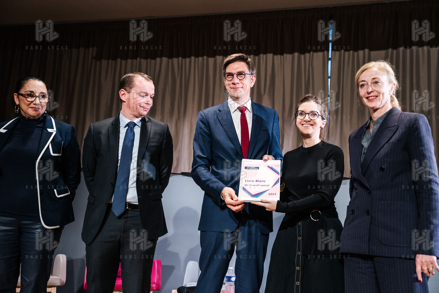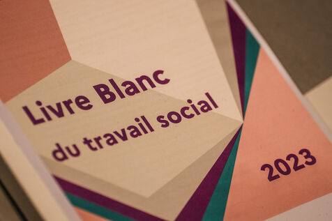 Ceremony at the Cité de Refuge de l'Armée du Salut to present the White Paper of the Haut Conseil du Travail Social (HCTS) to government ministers. The book is the result of in-depth work by HCTS national groups, local social work and social development committees, and contributions from various organizations.
