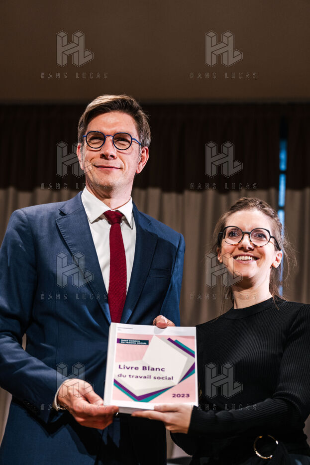 Cérémonie à la Cité de Refuge de l'Armée du Salut pour présenter le Livre Blanc du Haut Conseil du Travail Social (HCTS) aux ministres du gouvernement. Ce livre est le résultat d'un travail approfondi des groupes nationaux du HCTS, des comités locaux de travail social et de développement social, ainsi que des contributions de diverses organisations.