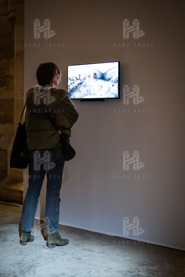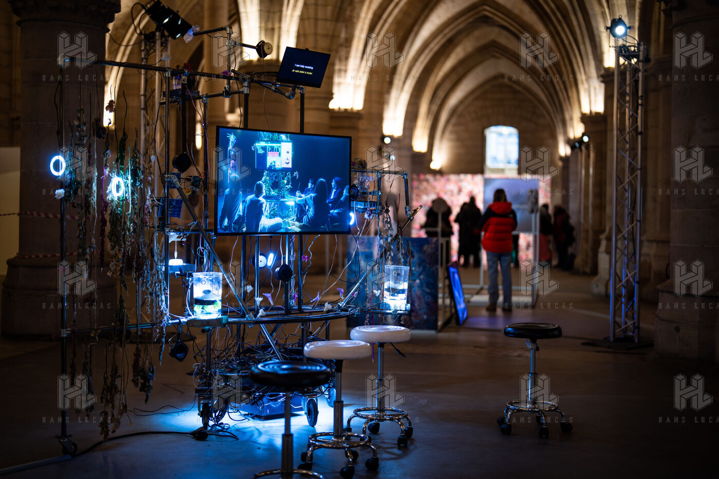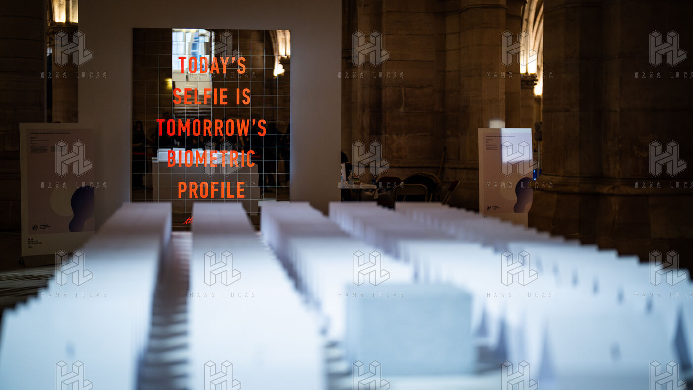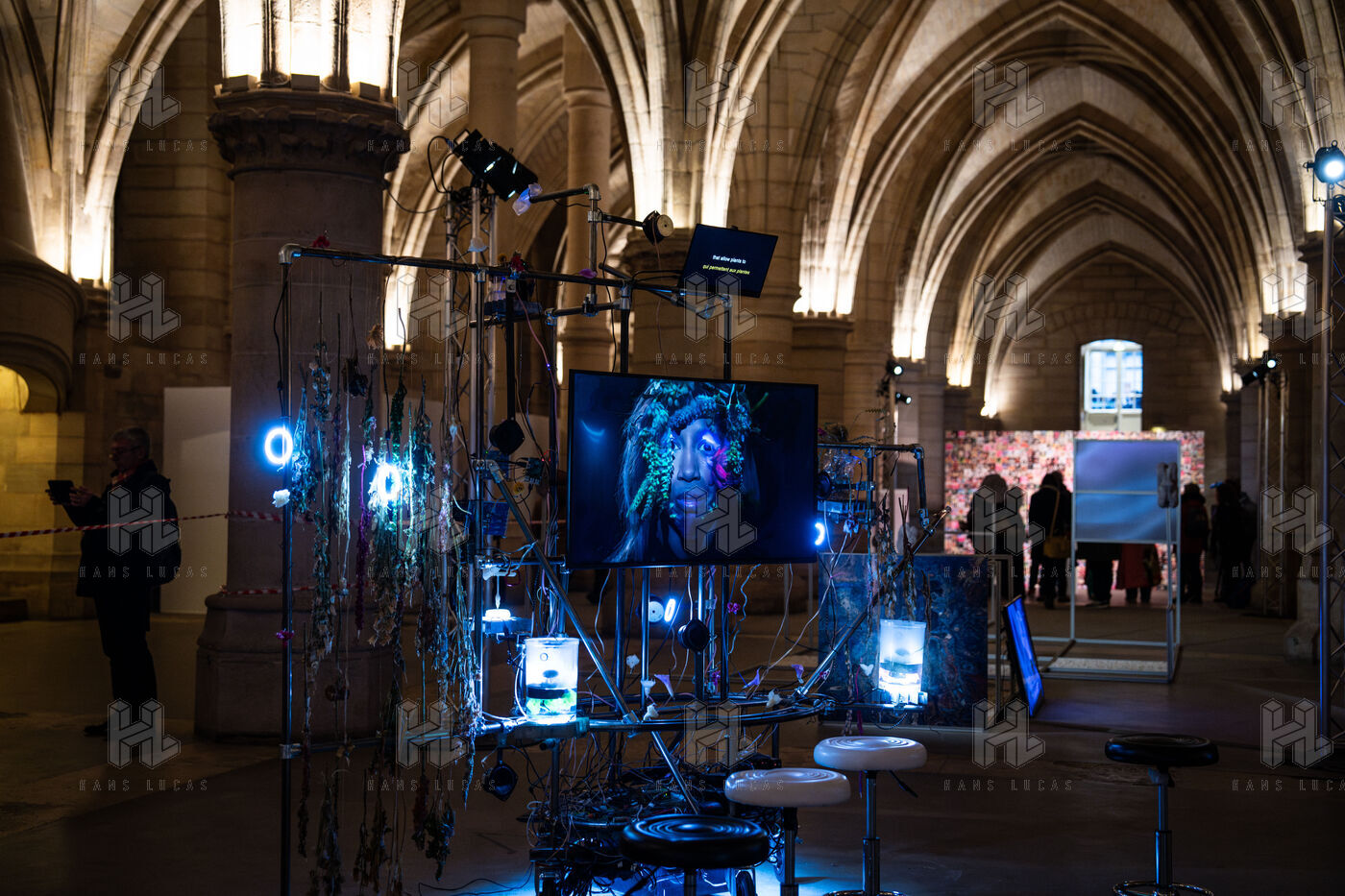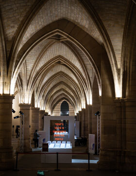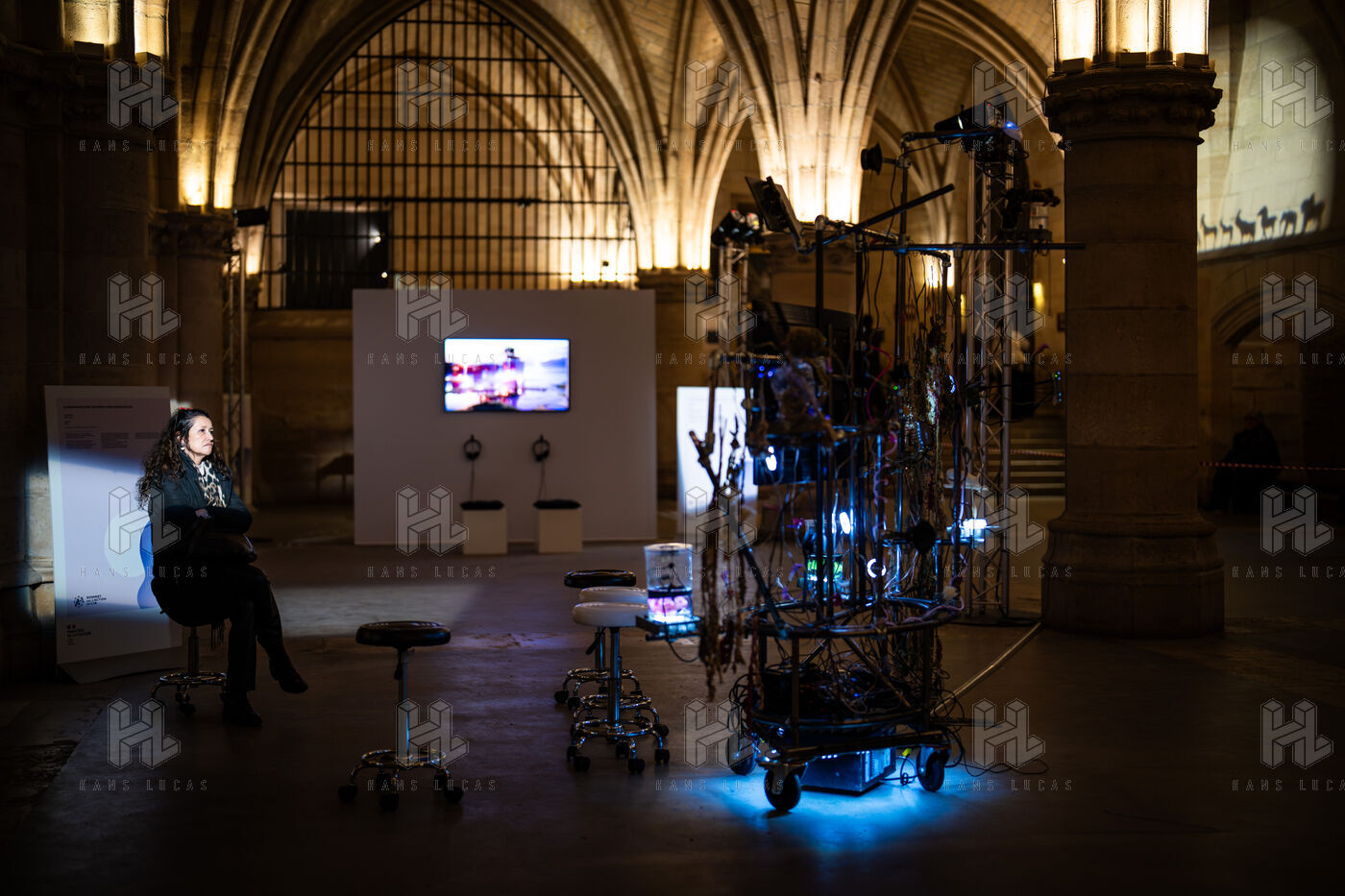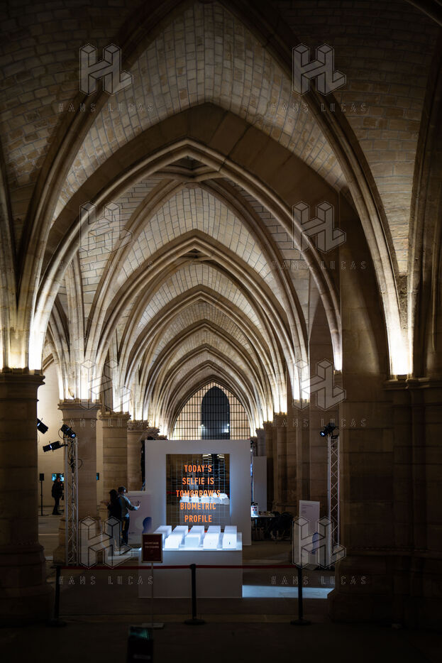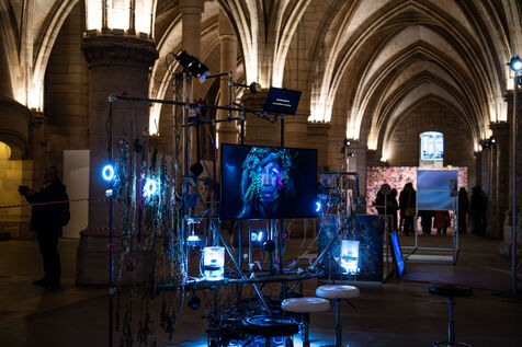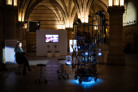 Exposition "Machina Sapiens", qui propose une vingtaine d'œuvres d'artistes français et internationaux explorant les enjeux de l'IA générative et son impact sur la société, à la Conciergerie de Paris.
