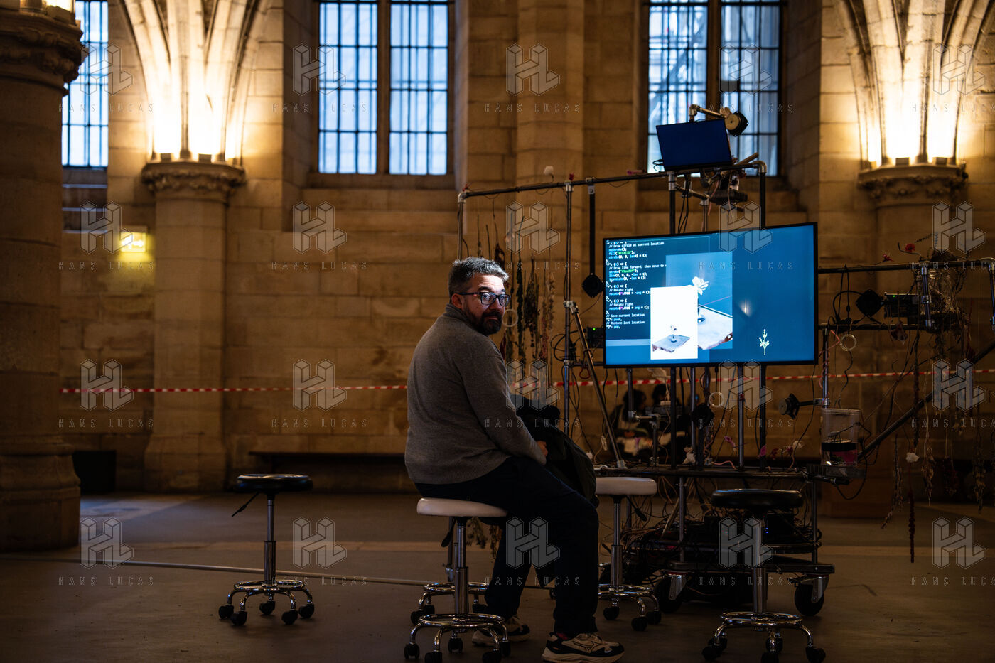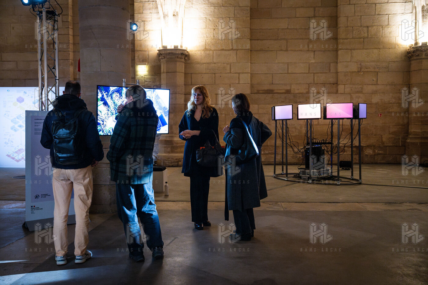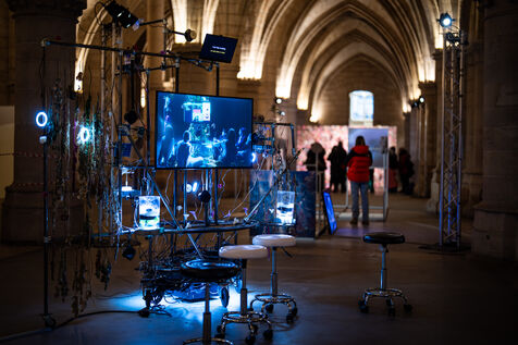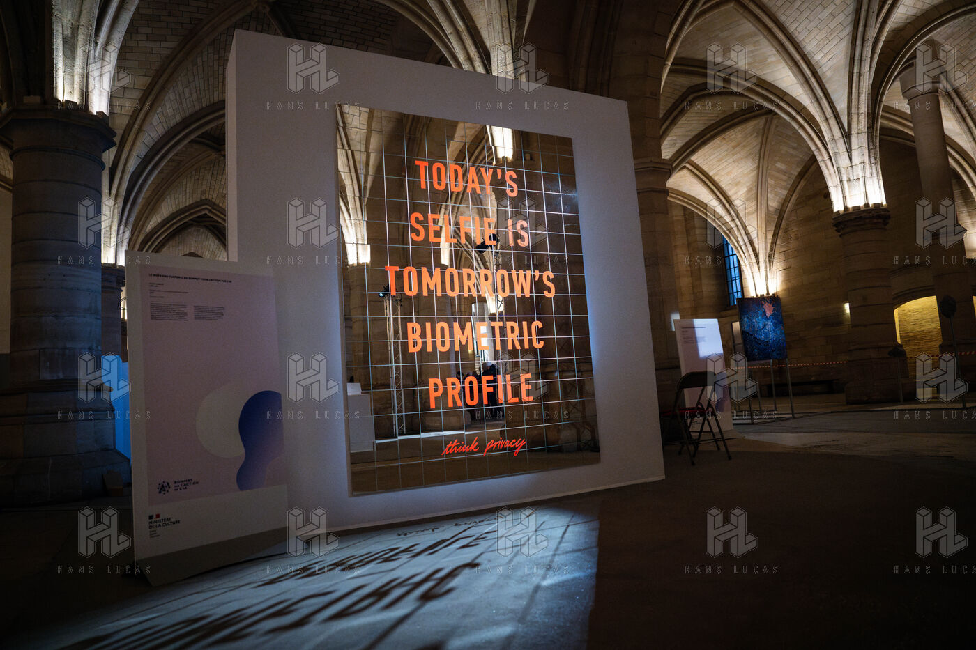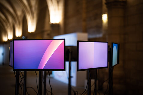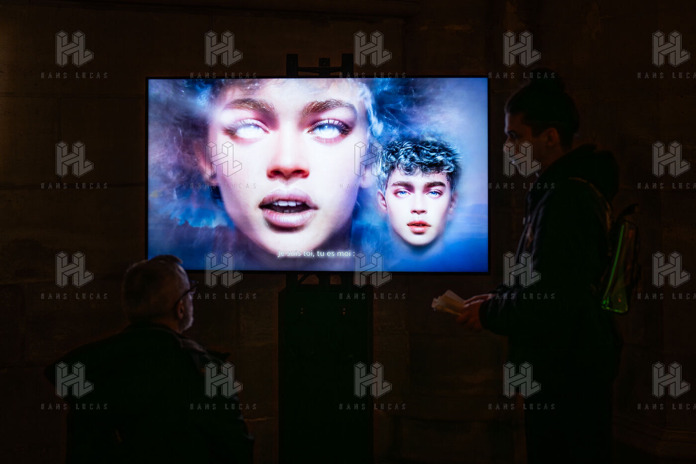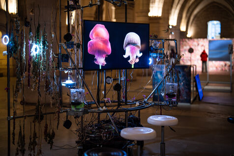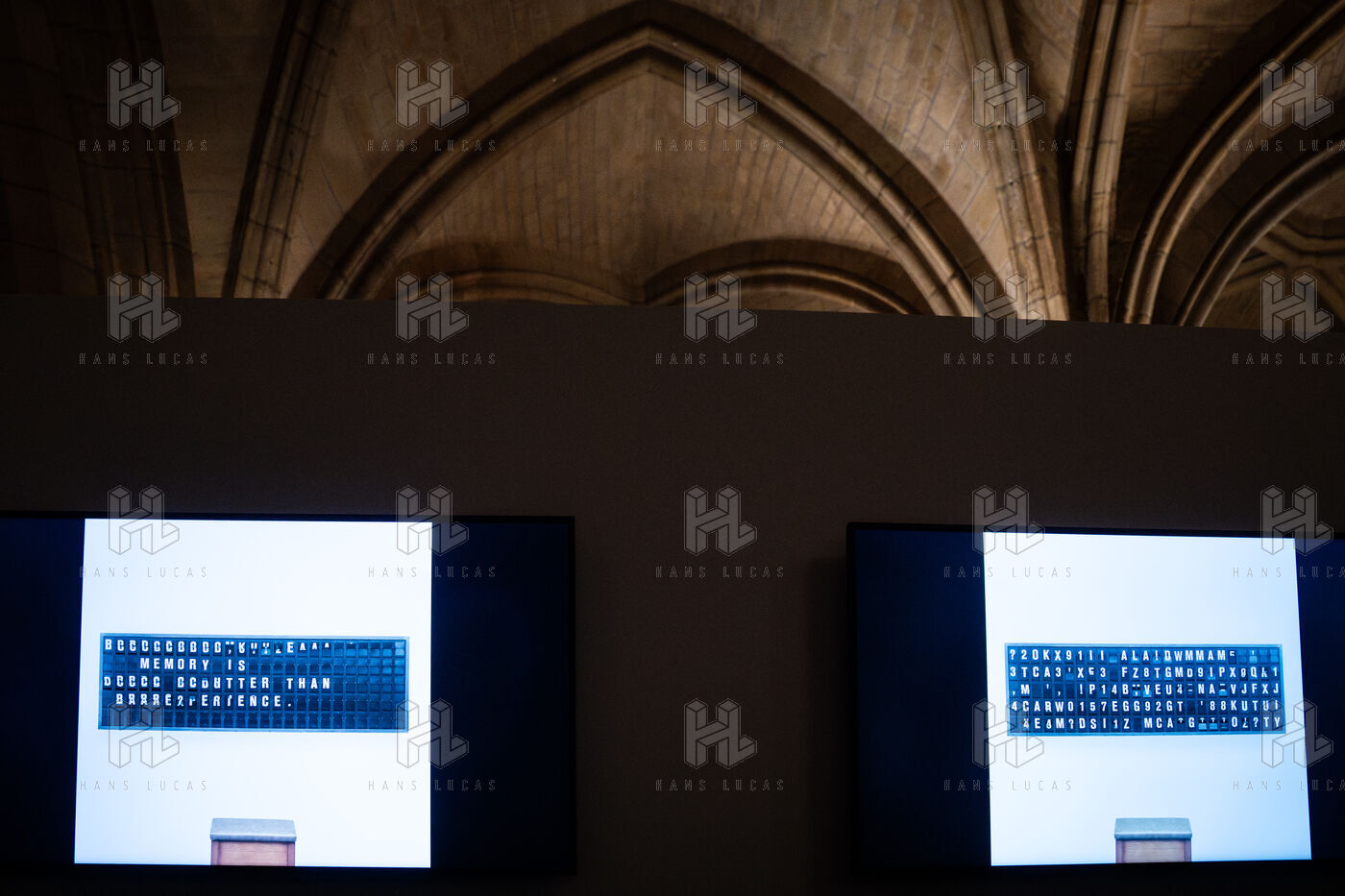 Exposition "Machina Sapiens", qui propose une vingtaine d'œuvres d'artistes français et internationaux explorant les enjeux de l'IA générative et son impact sur la société, à la Conciergerie de Paris.