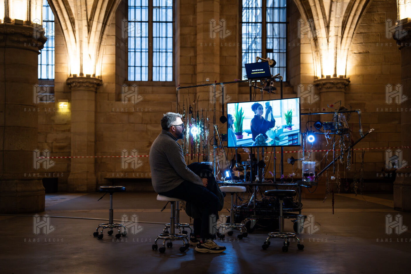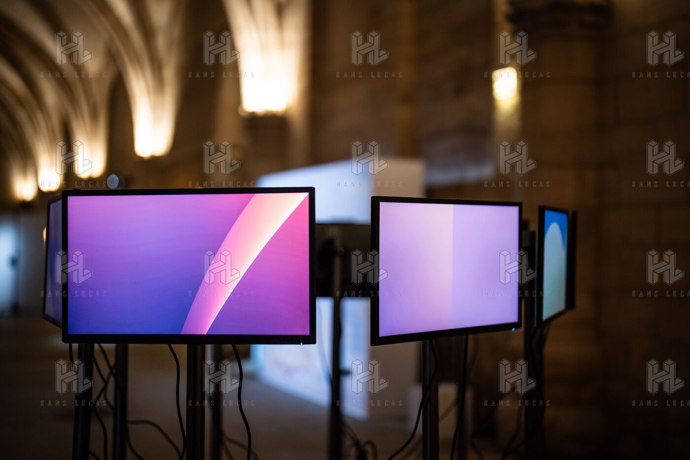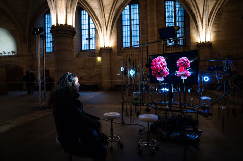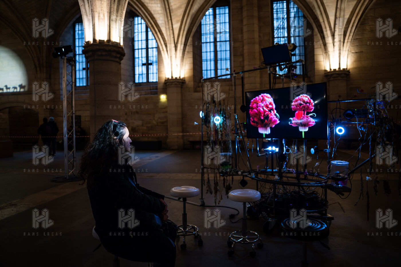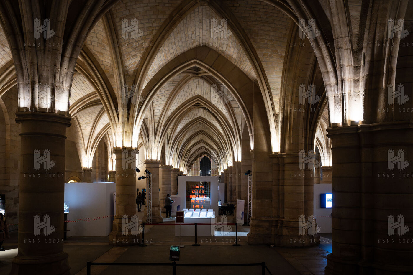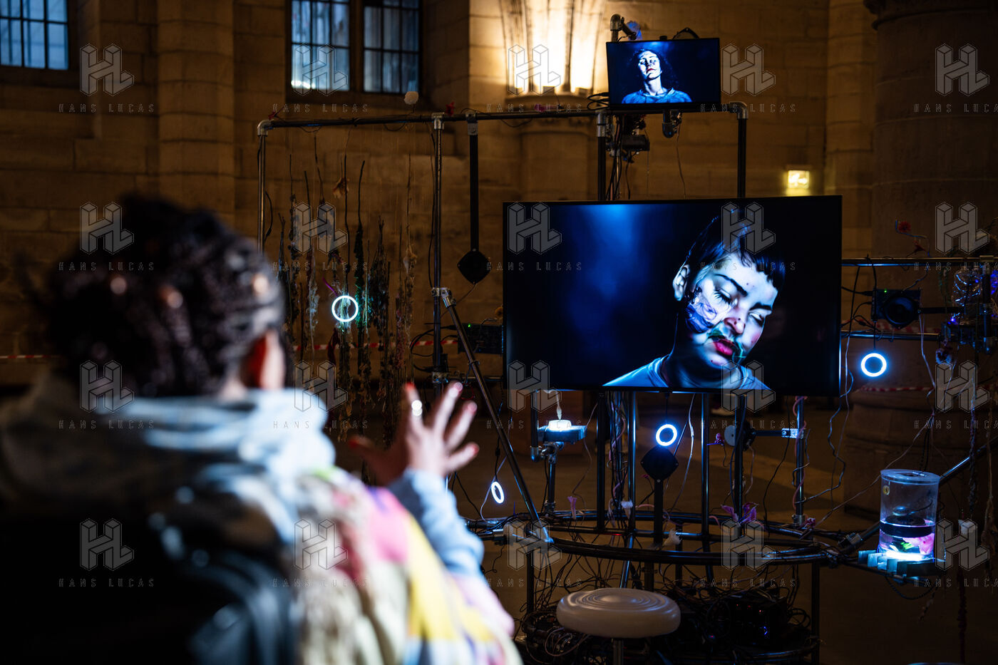 Exposition "Machina Sapiens", qui propose une vingtaine d'œuvres d'artistes français et internationaux explorant les enjeux de l'IA générative et son impact sur la société, à la Conciergerie de Paris.