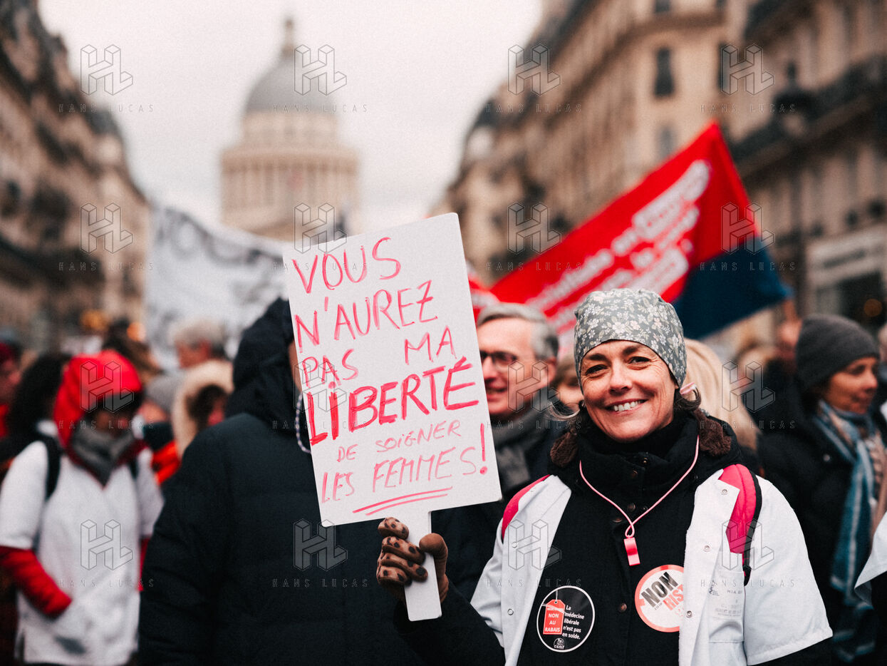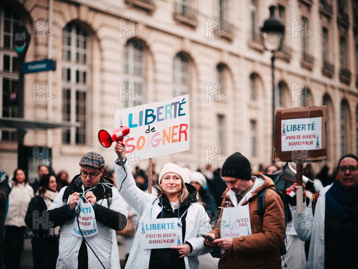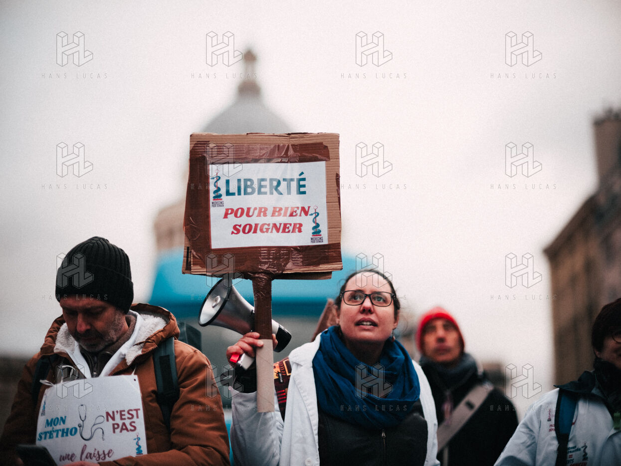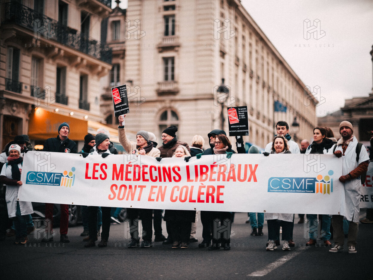 Joint demonstration by private doctors against measures detrimental to local healthcare in the 2026 Social Security Financing Bill (PLFSS) in Paris.