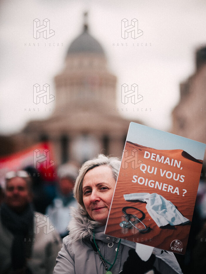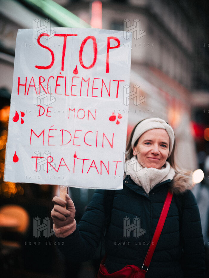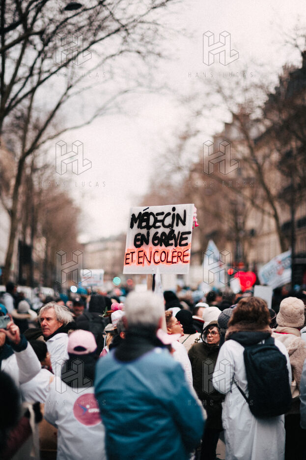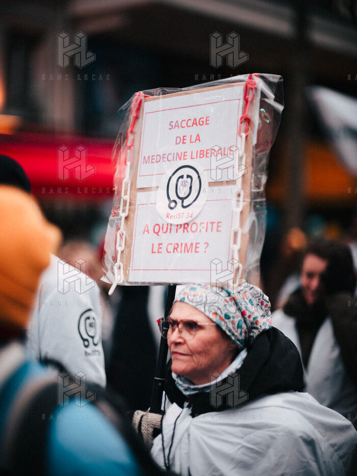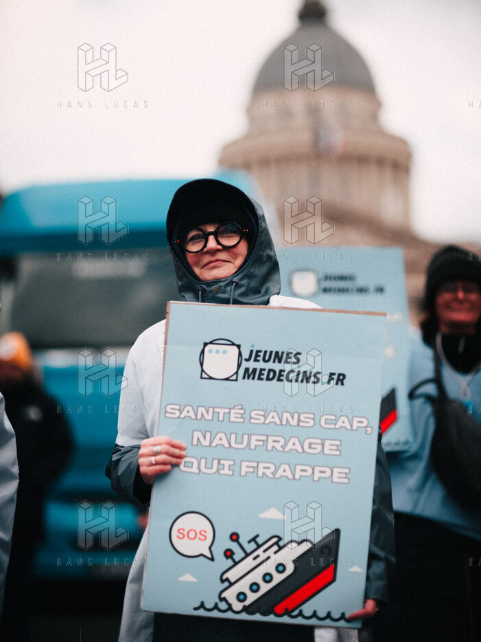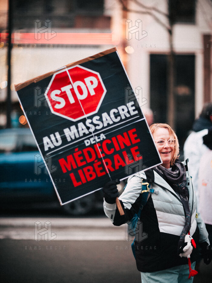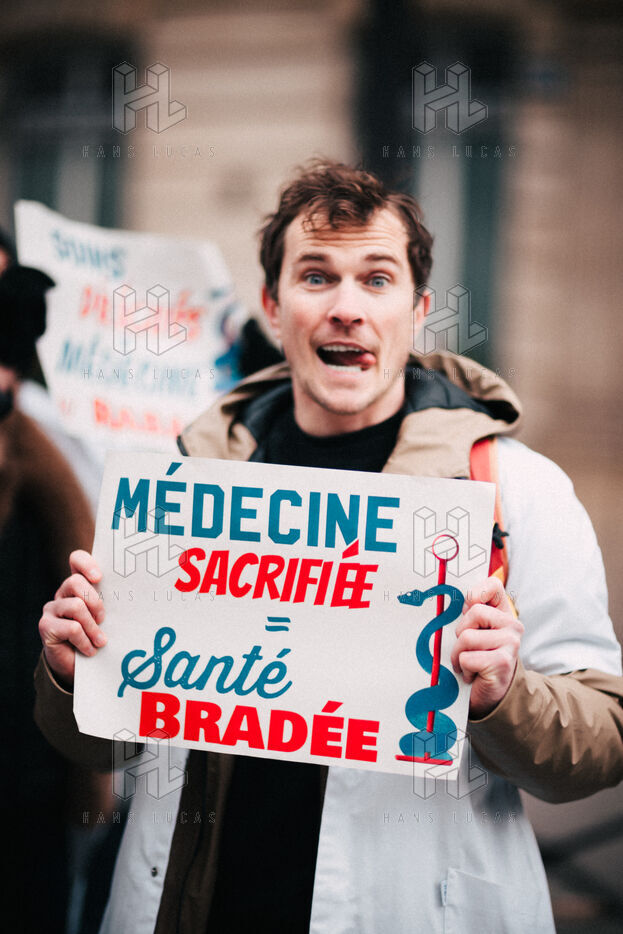 Joint demonstration by private doctors against measures detrimental to local healthcare in the 2026 Social Security Financing Bill (PLFSS) in Paris.