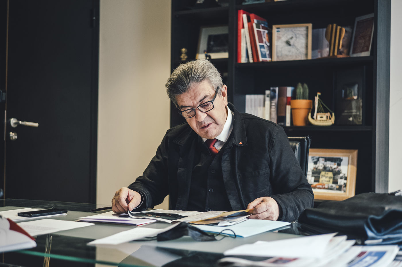 9 December 2021, Paris (75), FRANCE. Jean-Luc Mélenchon , president of France Insoumise, at the headquarters of the 2022 presidential campaign.