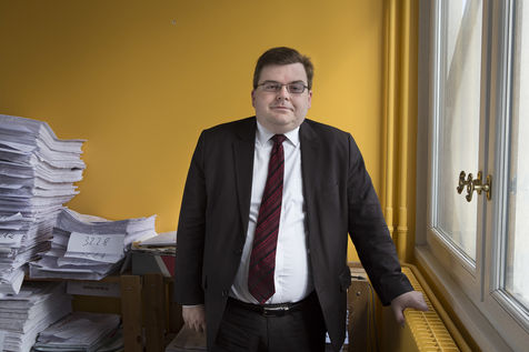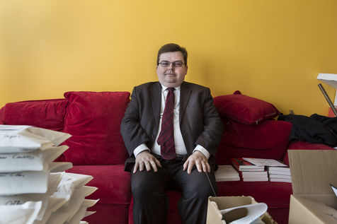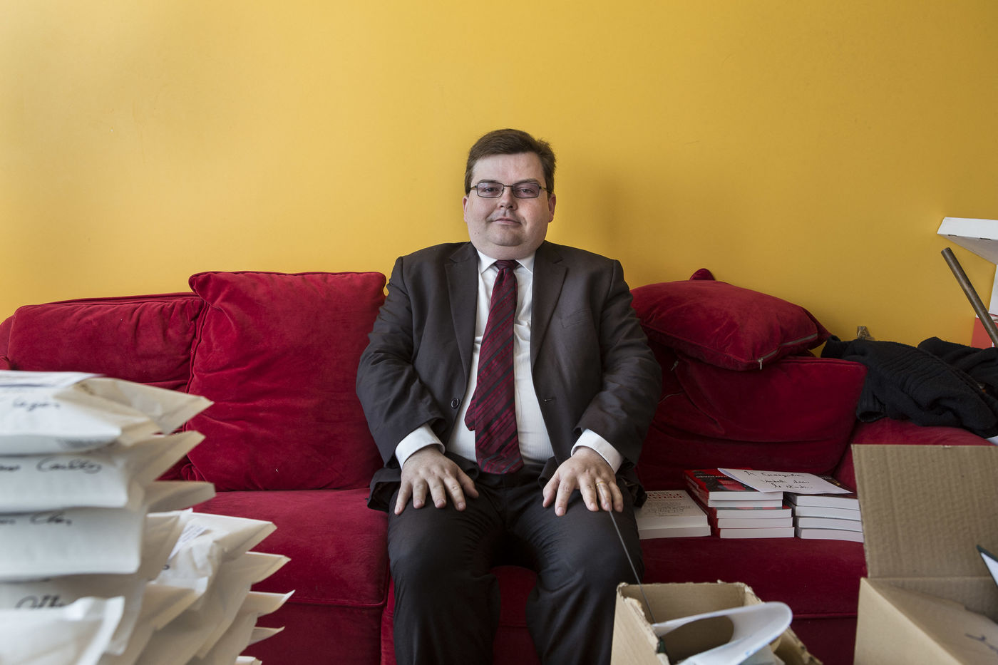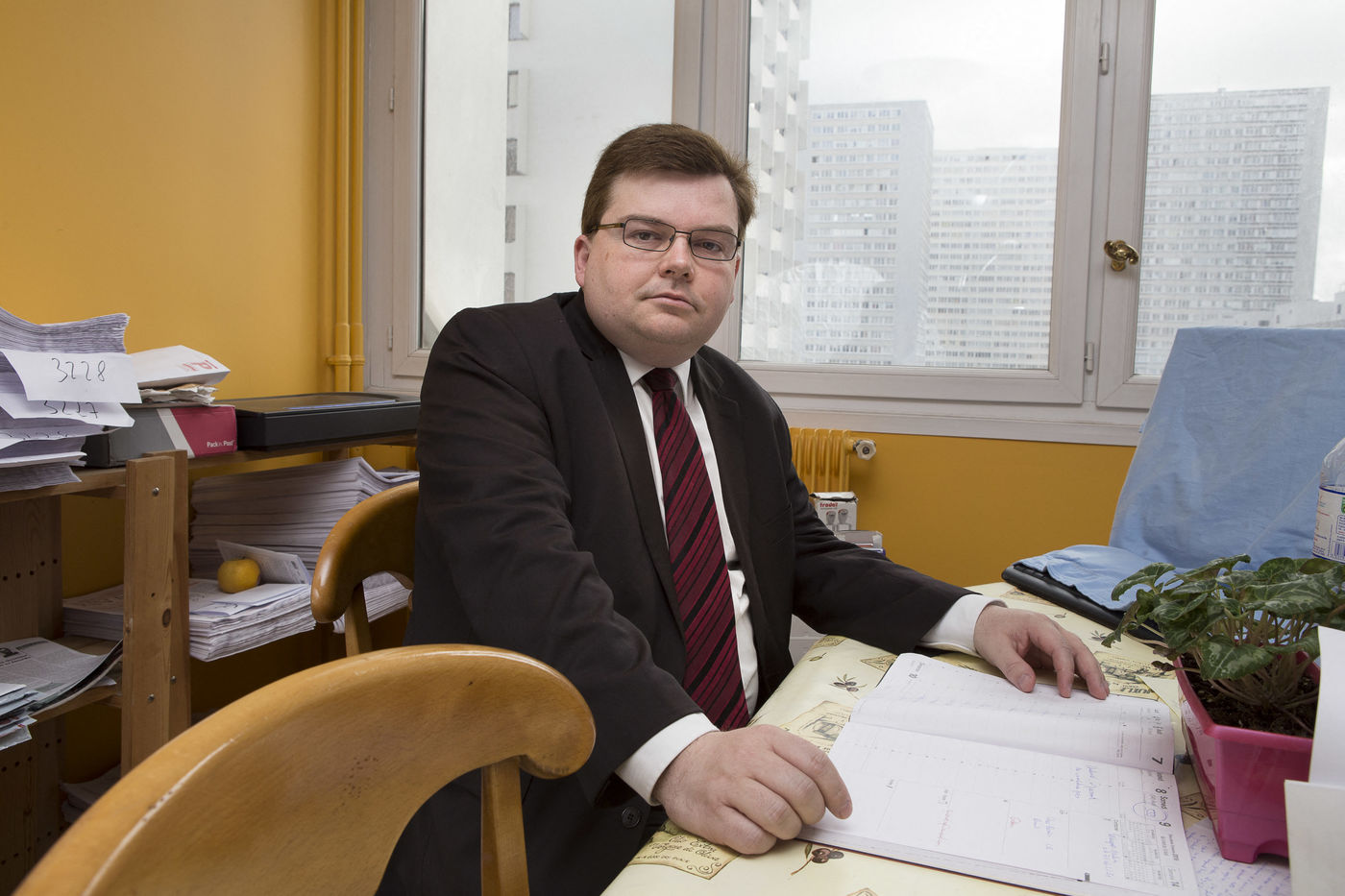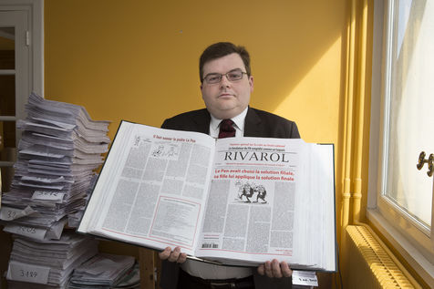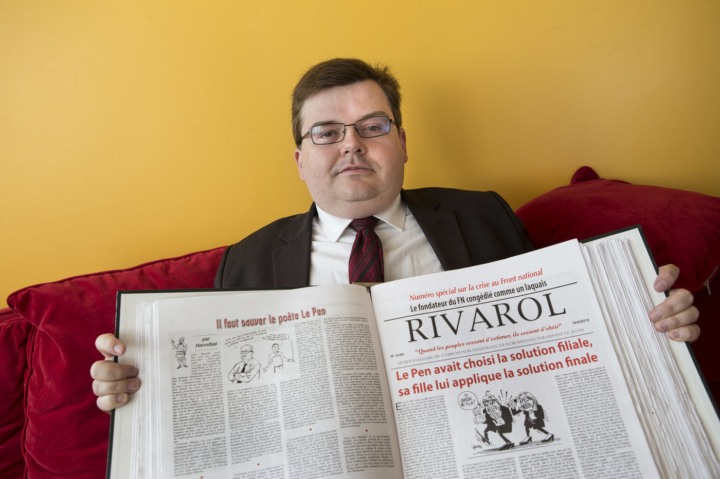 7 avril 2016, Paris (75), FRANCE. Portrait de Jérome Bourbon, directeur de la publication et rédacteur en chef de Rivarol, hebdomadaire d'extrême droite, au sein des locaux de Rivarol situés dans une tour du 13ème arrondissement de Paris.